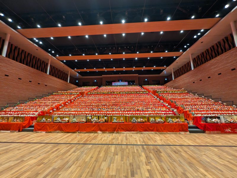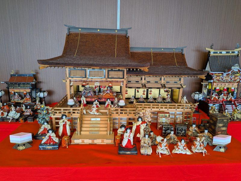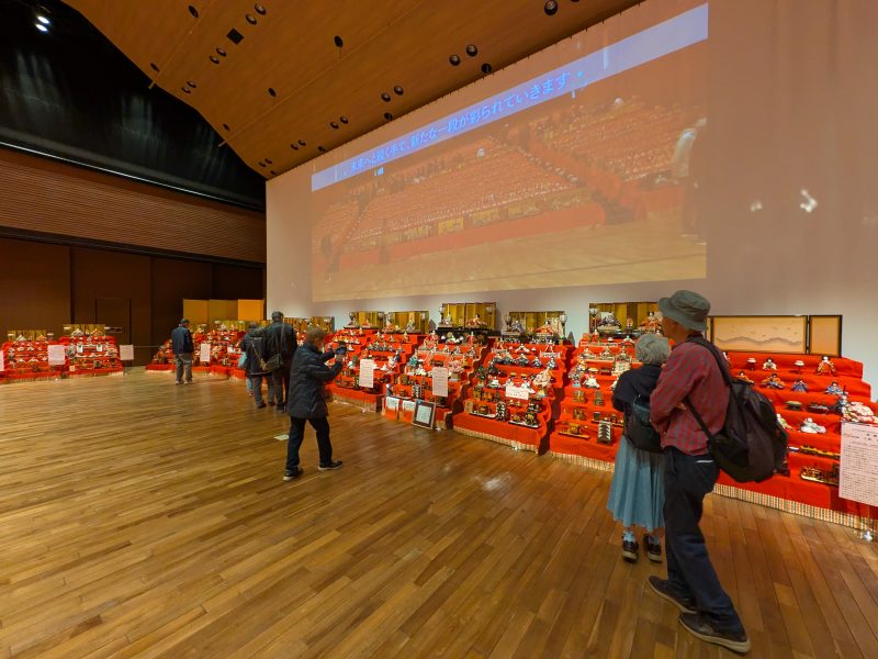 コロナ禍の期間は室内のため、ひな飾りは実施されておらず、昨年から再開されたとのことであった。コロナ禍前に一度見ていたので、大ホールのひな壇のスケール感は覚えており、改めてスケールの大きさには驚かされた。