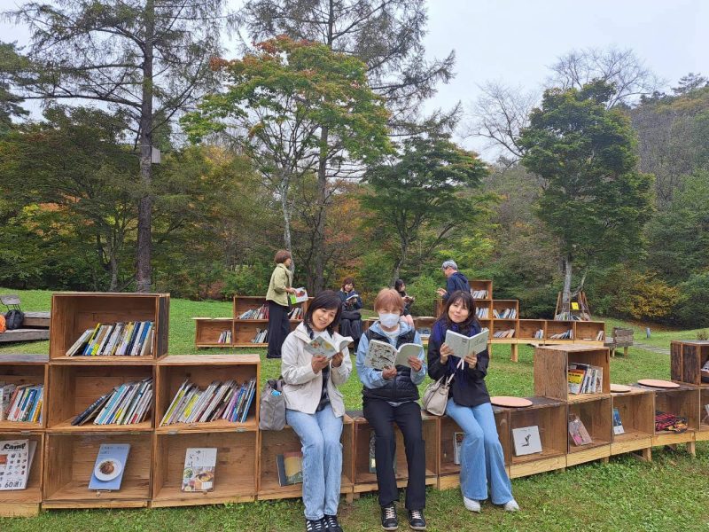 写真は、テラス内の野外図書、天気が悪い時には片付けが大変であろう。