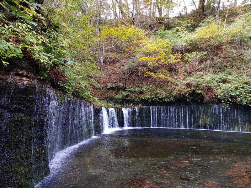 高さ3m、幅70mの岩肌から数百条の地下水が白糸の如くに落下する美しい滝です。冬も枯れることなく湧き出しており、浅間山に降った雨が地下に浸透し湧き出るまでに6年ほどかかります。水温は11.8度と高めですが、これは火山活動に伴う地熱の影響によるものと考えられています。とのこと。