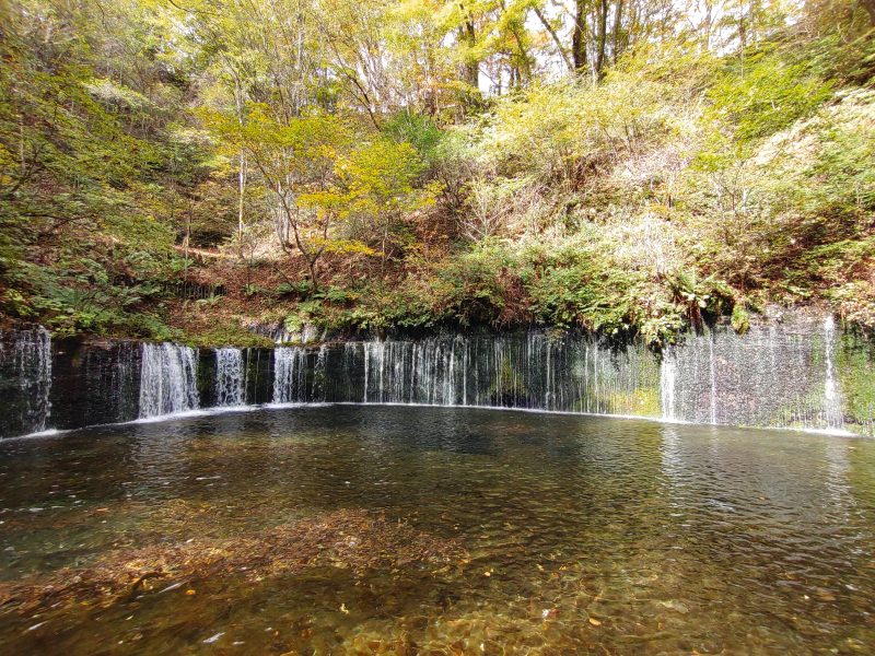 川から流れ落ちる滝ではなく、岩肌から地下水が湧き出るので白糸の様な細い流れになっておりとても綺麗に見える。