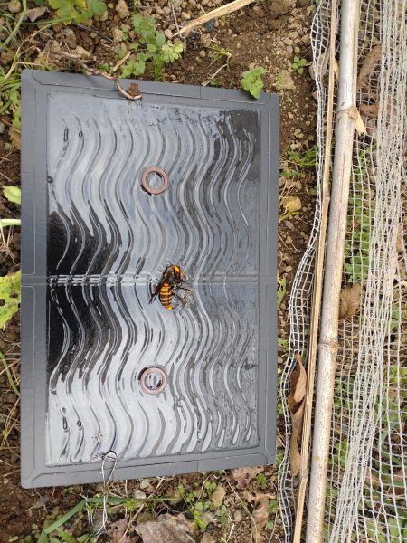 おそらく、先週からオオスズメ蜂の襲来は極端に少なくなったものであろう、写真の様に新しいペッタンコを1箇所設置したが、まだ蠢いているオオスズメ蜂を1匹乗せて置いた。