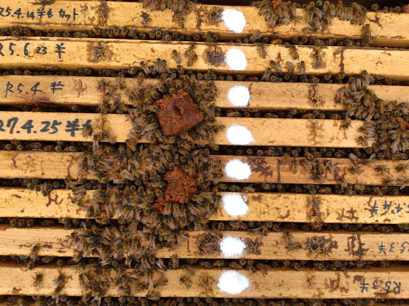 8月16日の内検時、巣枠の巣房に蓄えられているはずの「花粉」が2群ではなく、他の2群では少しある程度で、次回内検時から代用花粉の給餌が必要なレベルとなった。