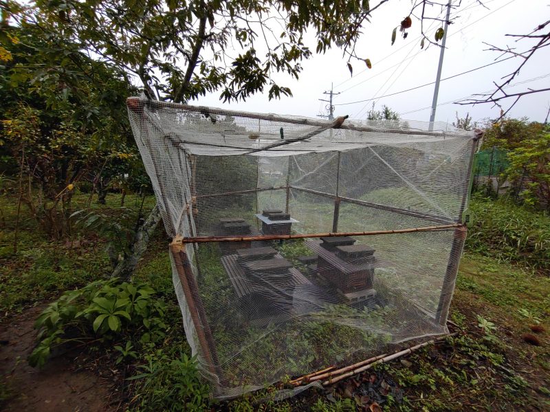 まずスズメ蜂防護のネットを見回したら、写真の様にやや左に傾きが有ったもののネットが切れたりはなかった。