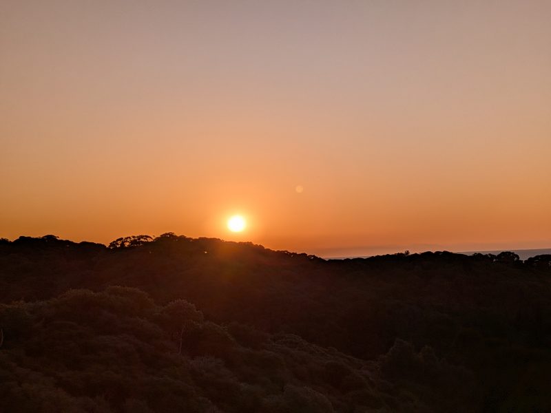 日の出の色、いい感じです。太陽の右上の丸いものは何でしょうか。