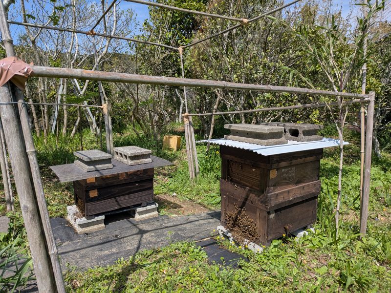 写真の右側が、内検を終え2段化にしたところ、入口には多くの蜜蜂が見られる。
